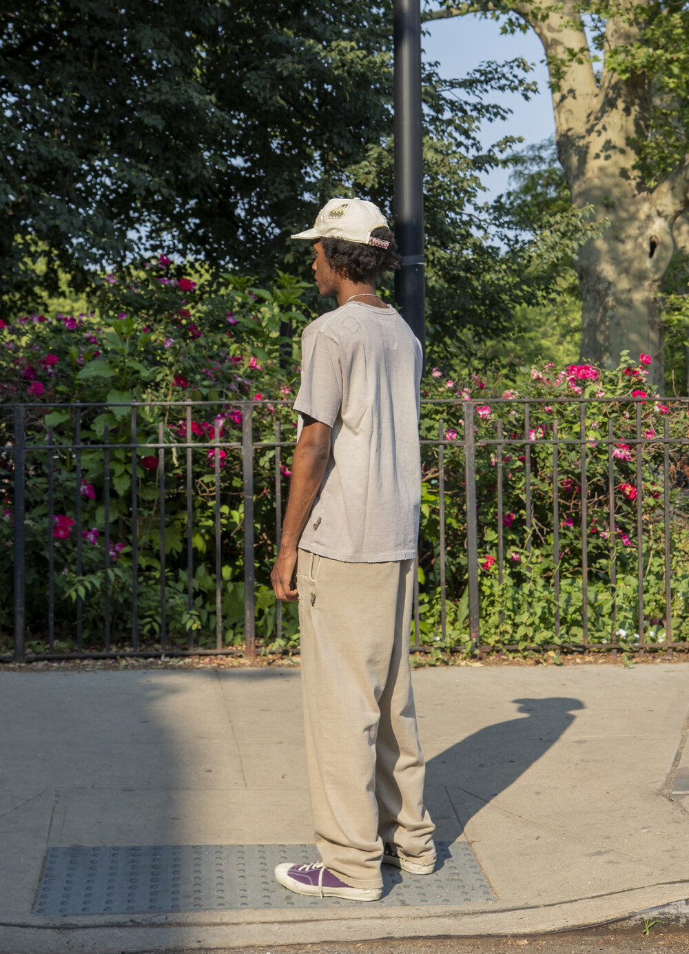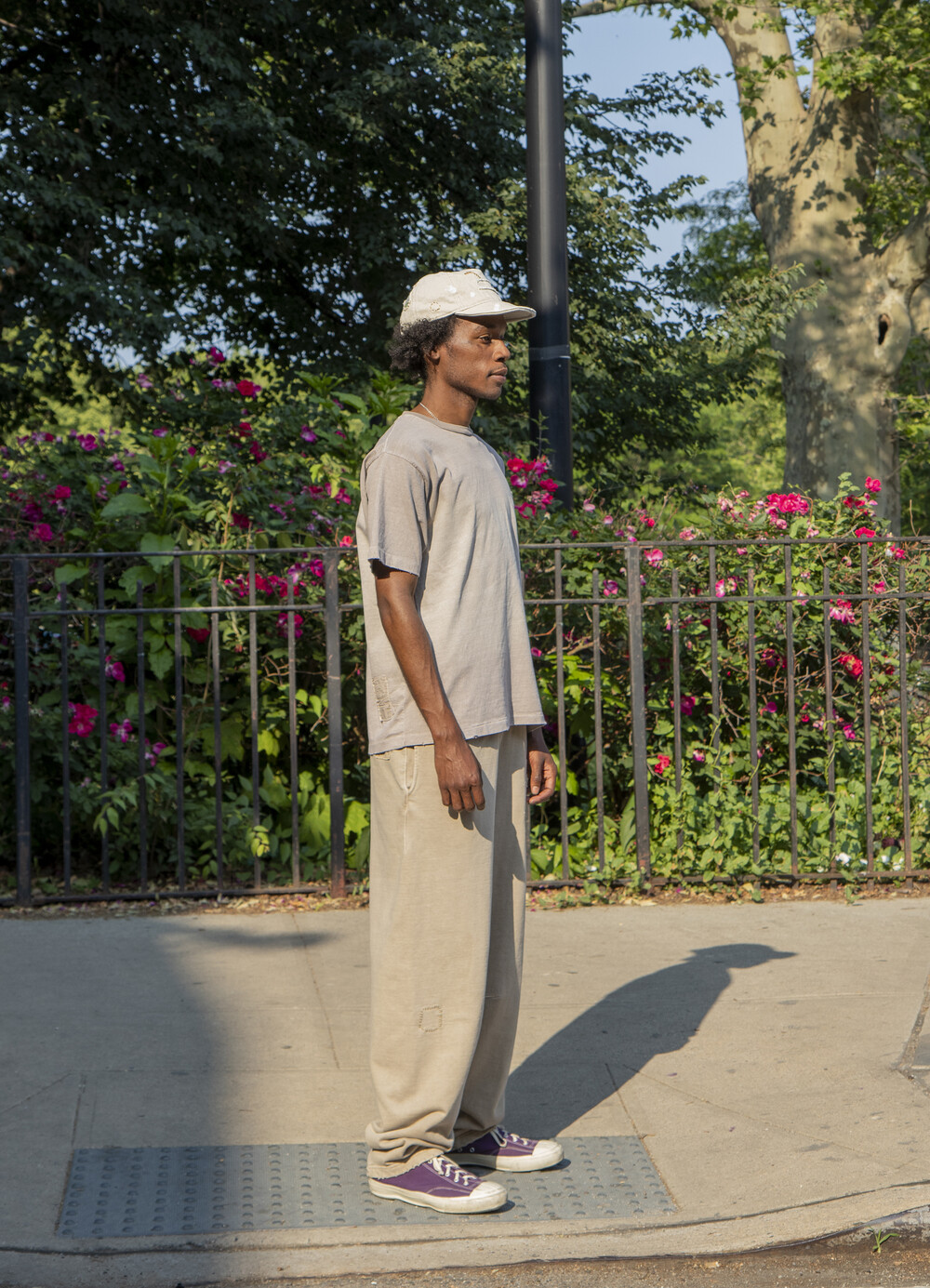 -긴 밑위 길이, 무릎과 엉덩이의 다트로 루즈하지만 둥근 모양의 핏과 편안한 활동성.