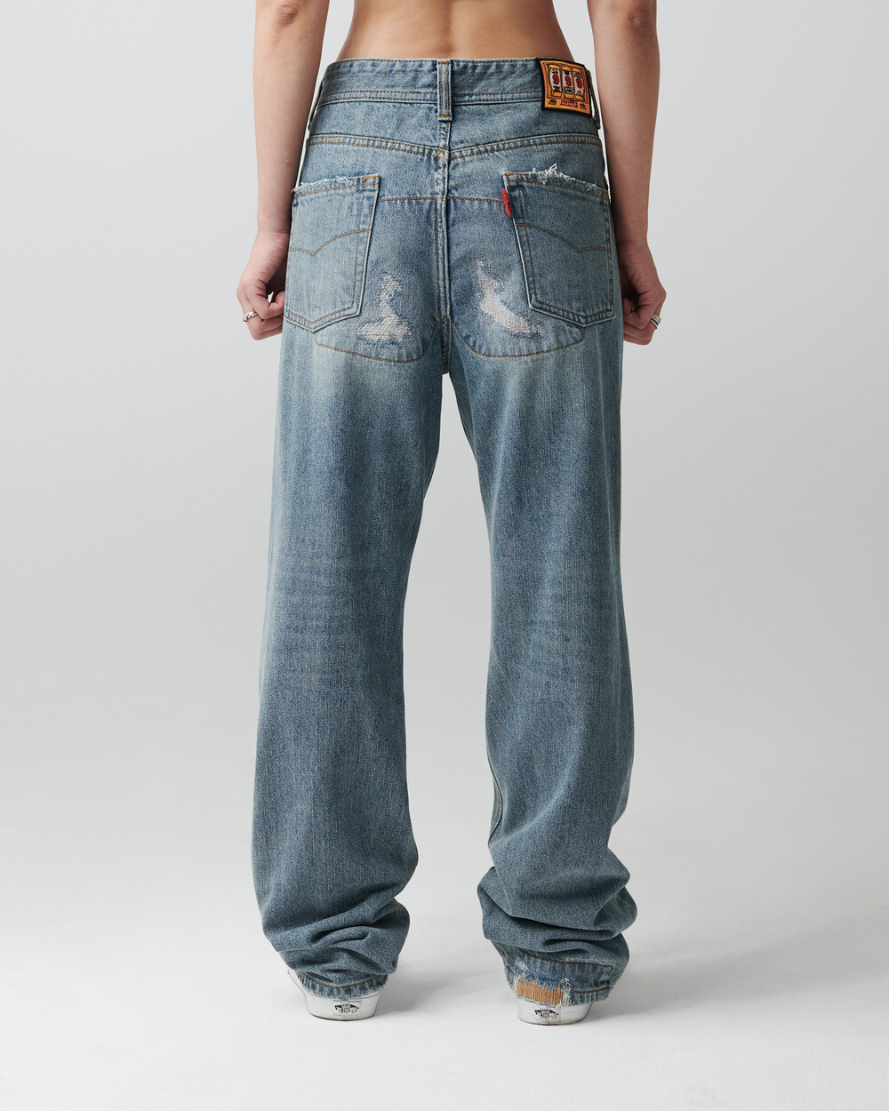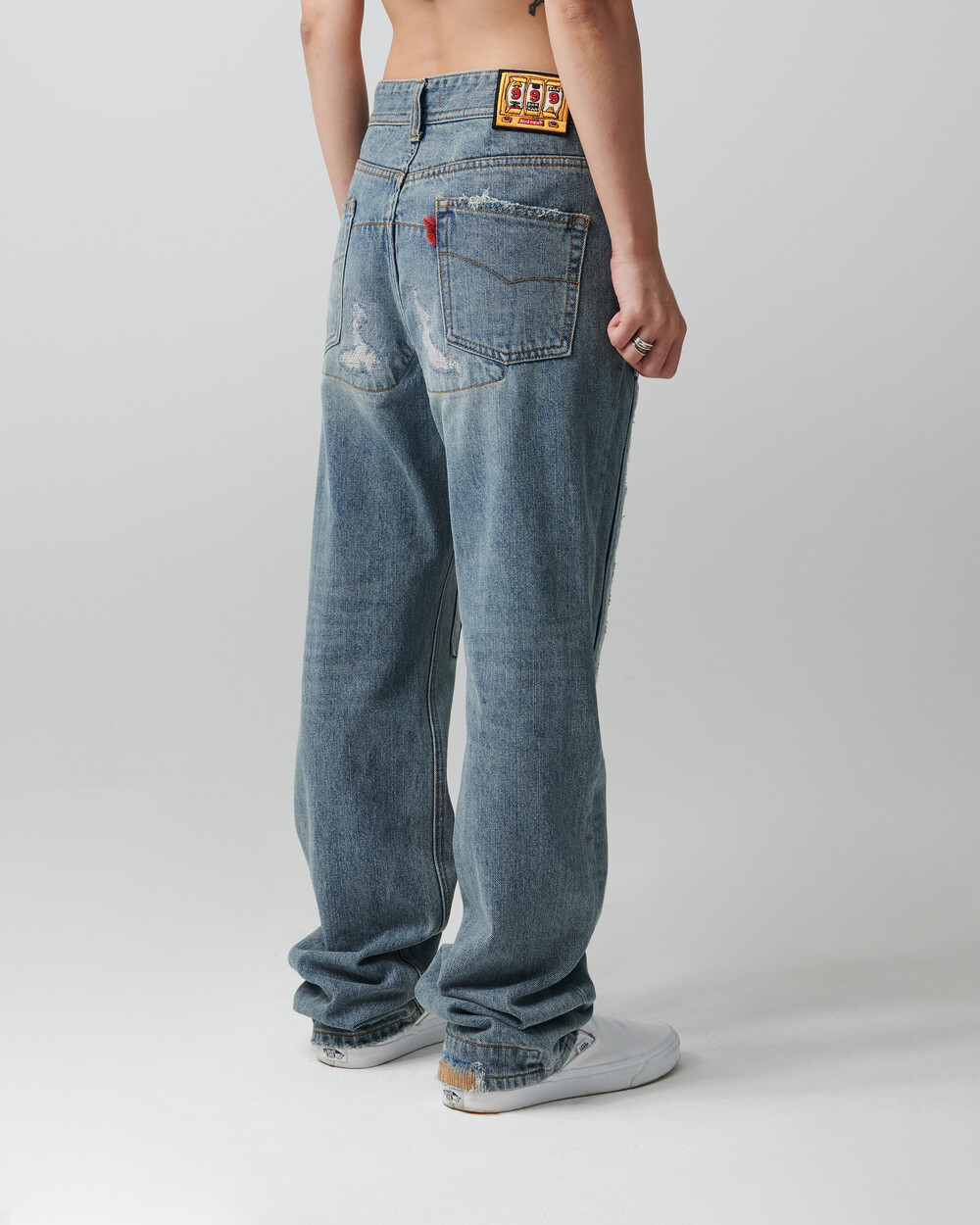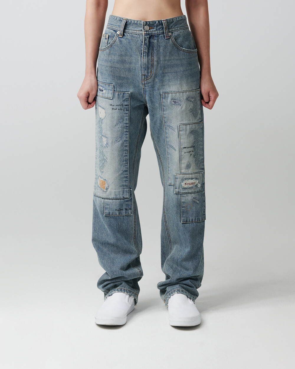 -무릎과 밑단 뒷면에 코듀로이를 이용한 리워크 디테일이 있습니다.