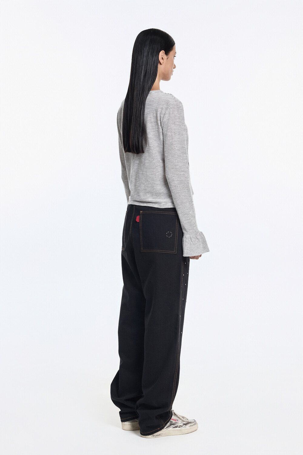 플레어 형태의 러플 소매로 여성스러운 실루엣에, 거칠고 빈티지한 무드의 프린팅과 가장자리에 데미지를 더해 상반된 매력을 조화롭게 섞은 디자인.